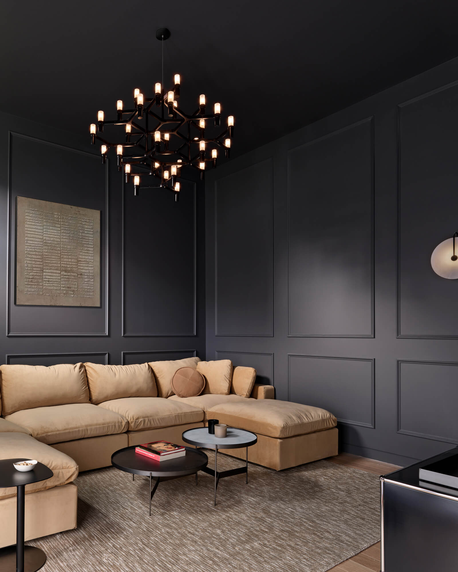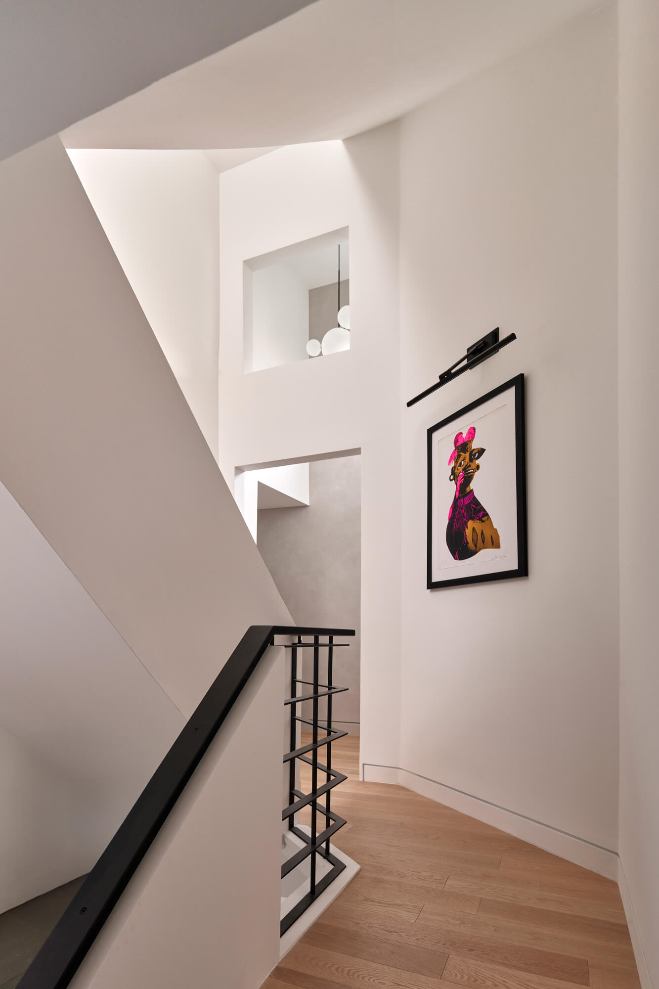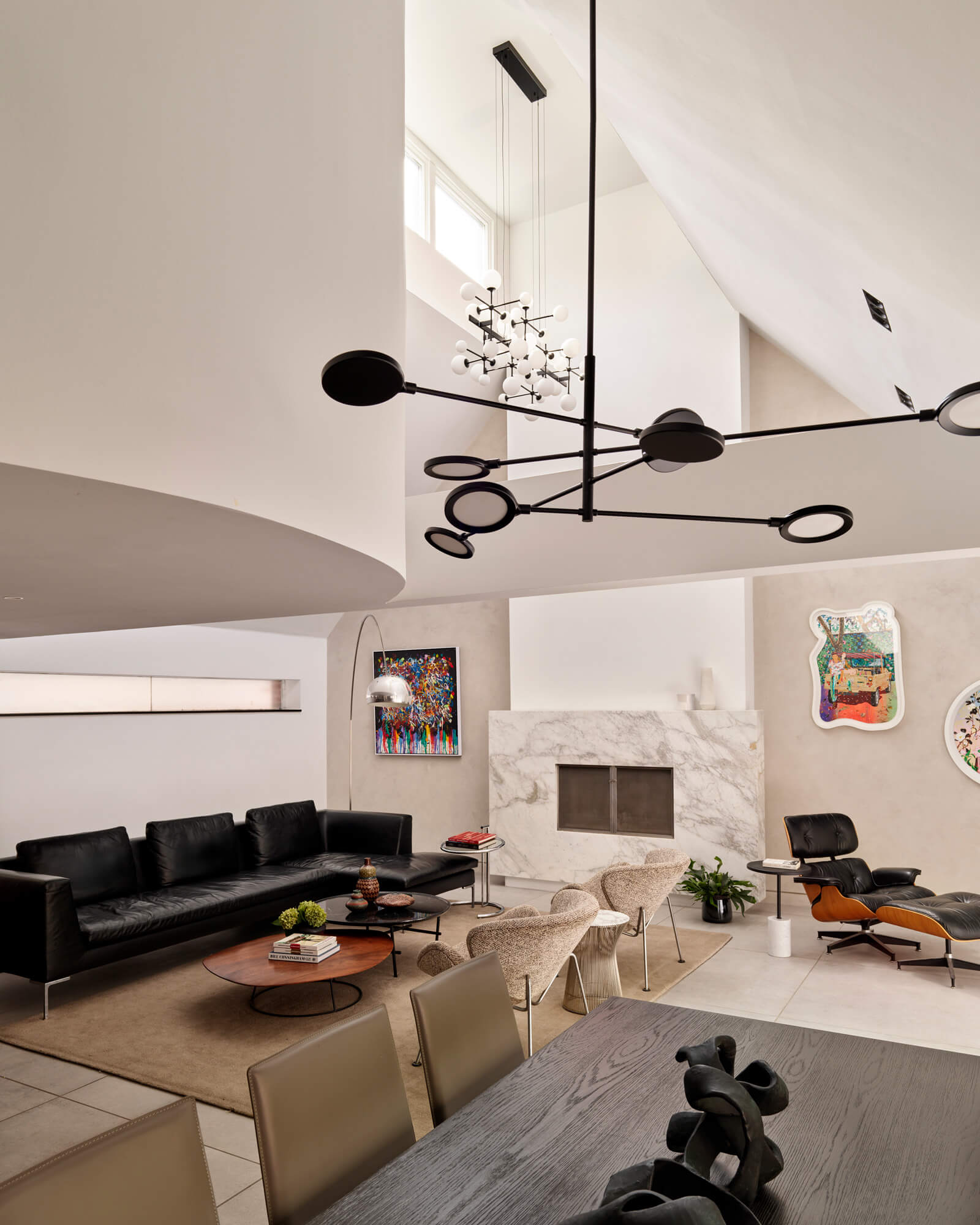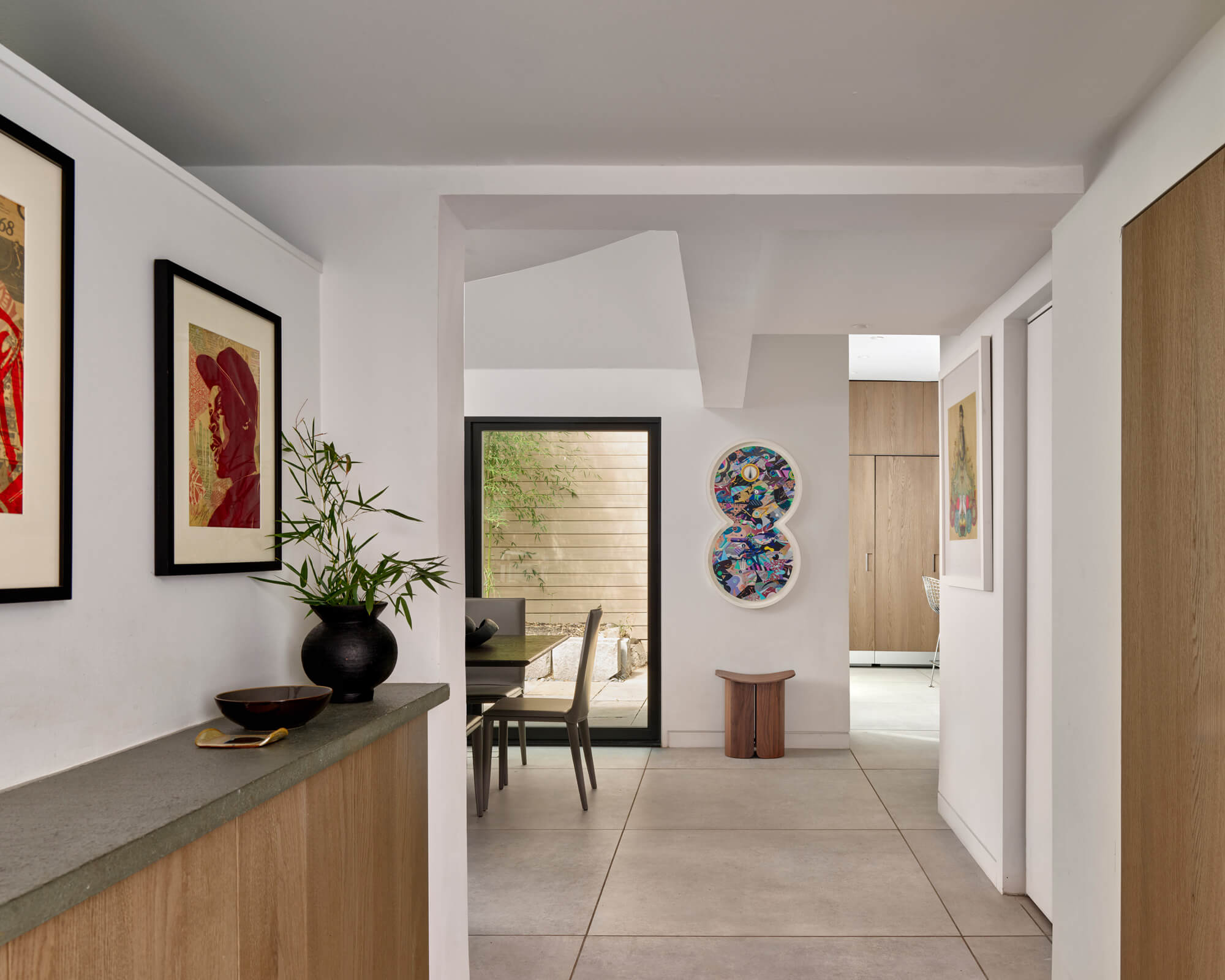 k YODER design renovated a contemporary single-family residence into a classic modern home. The multi-year phased scope of work began with renovations to the first-floor kitchen and living room. The kitchen features an Italian Arclinea cabinetry system with concealed appliance bay and wine bar. Marble counters and smoked glass complement cabinets in cerused oak – a limed finish that emphasizes the natural wood grain. Consistent new porcelain floors extend throughout the first level, and new sliding doors provide access to an outdoor courtyard from two sides. New layered lighting highlights a curated collection of new and vintage midcentury modern furniture and the owners’ eclectic art collection. Second-floor updates include a moody den with paneled walls, a shared children’s bath, an office with custom built-ins to accommodate the home’s unusual geometry, new white oak flooring, and new doors.