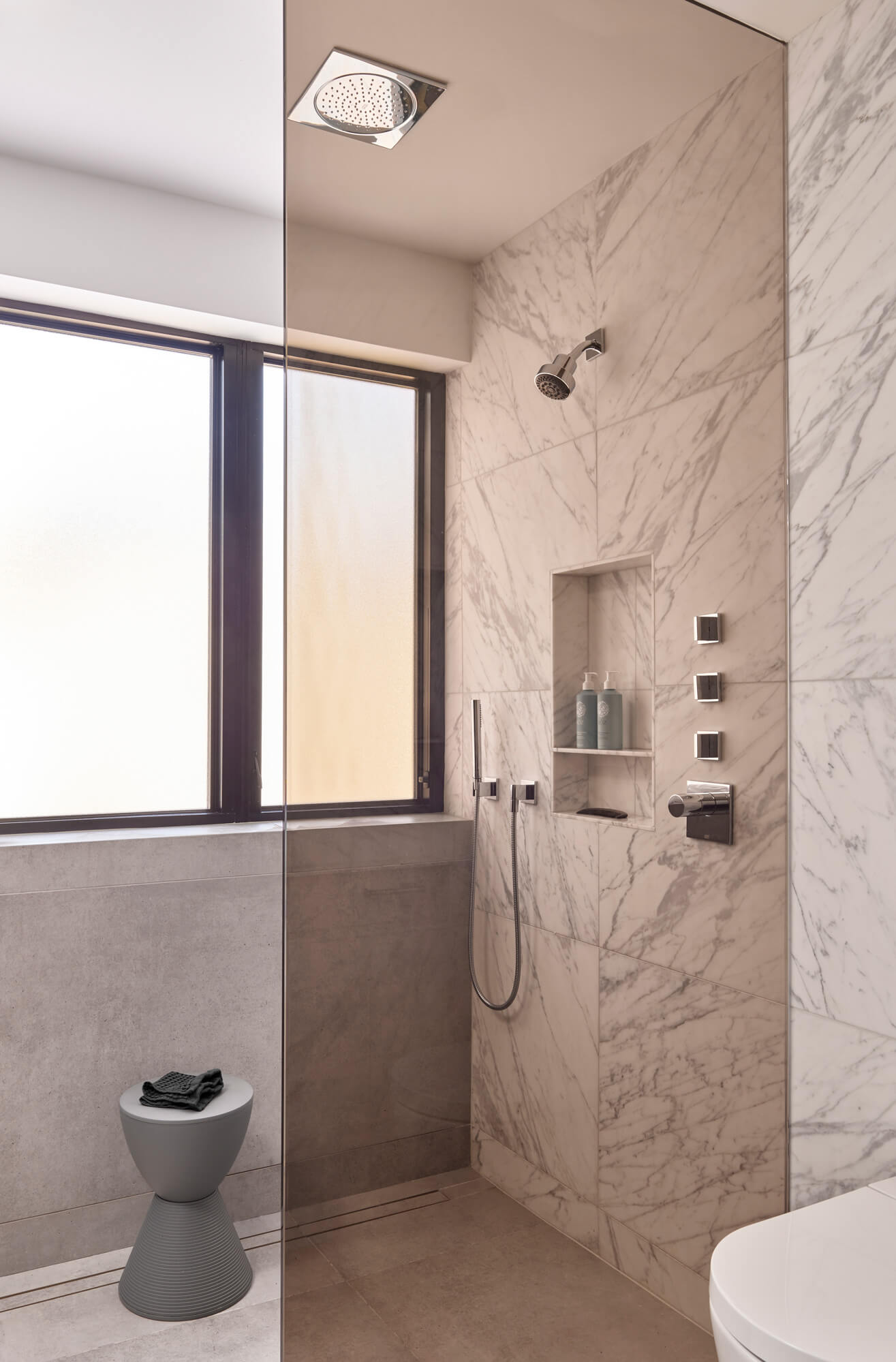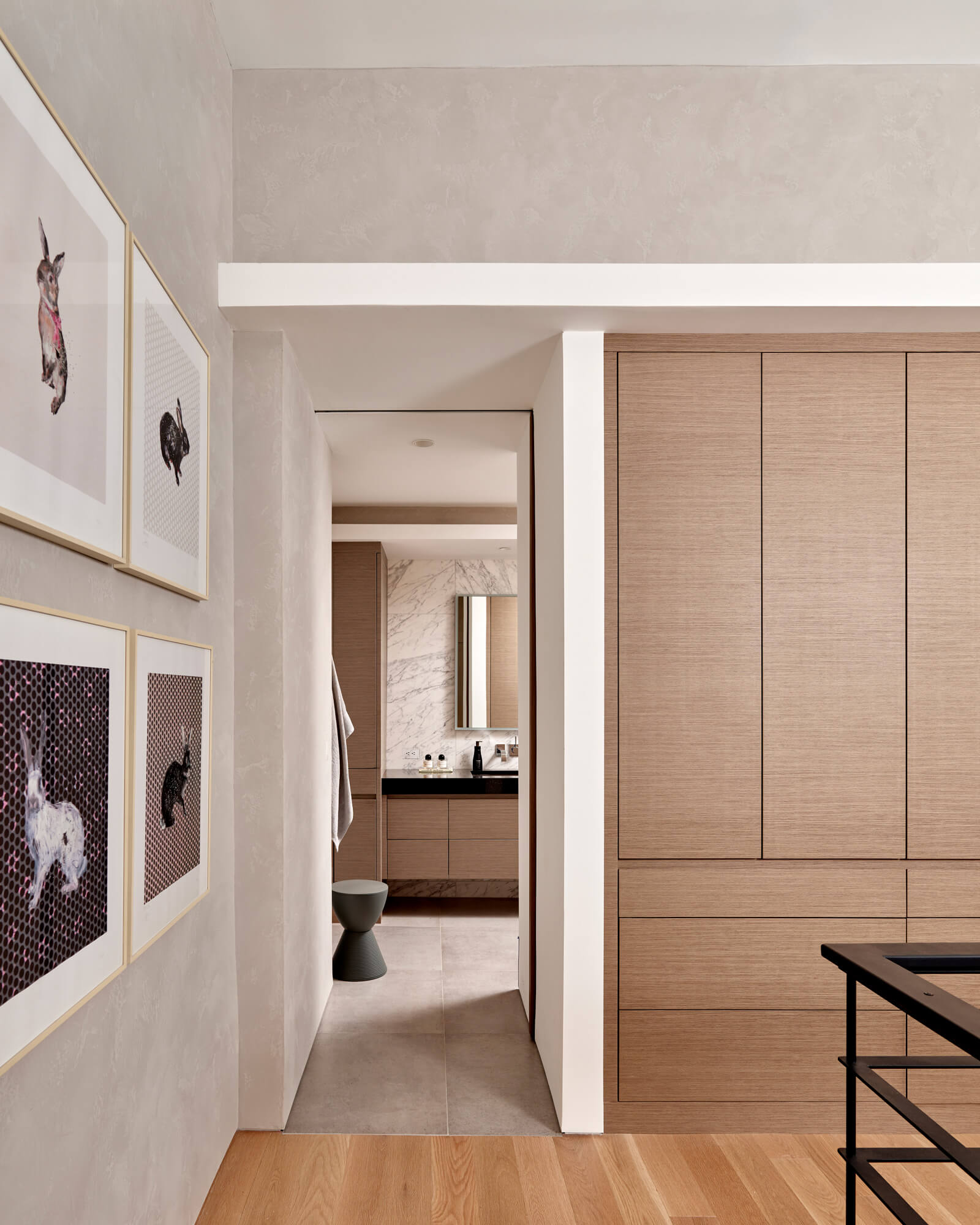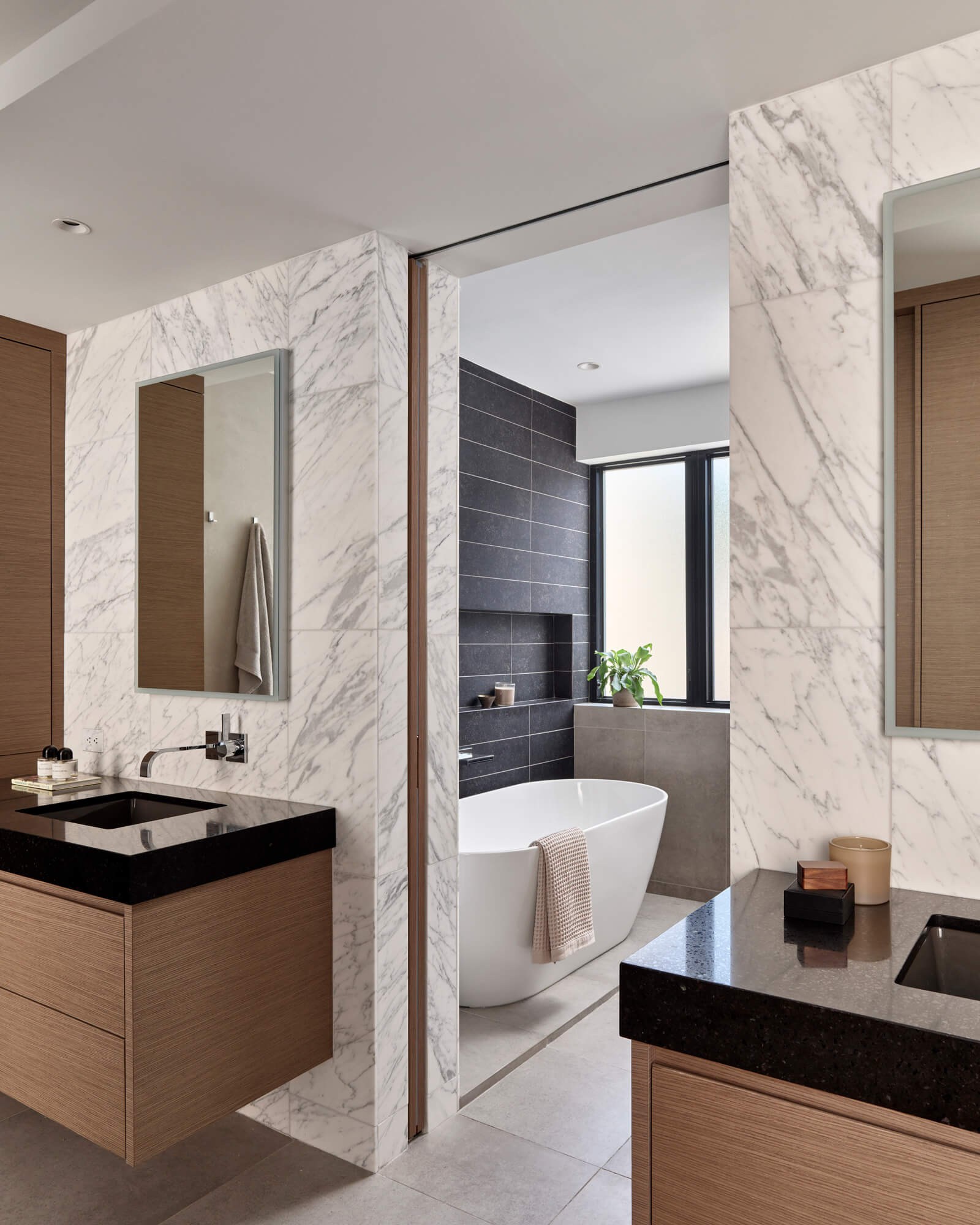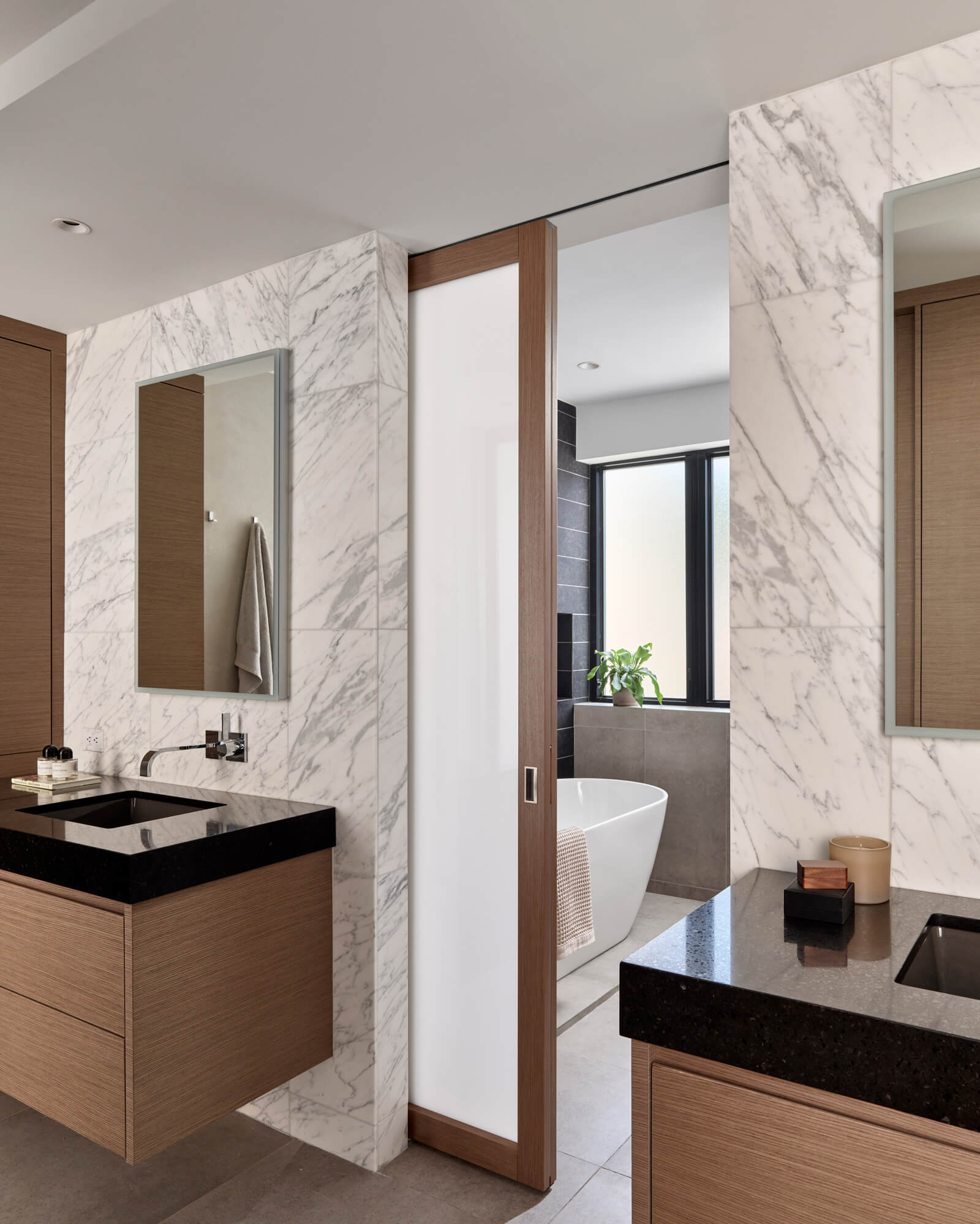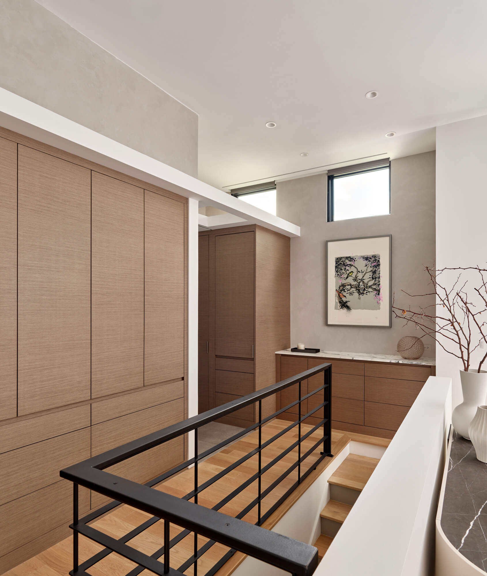 The project culminated in a third-floor primary suite with extensive custom cabinetry. A compartmentalized bath and two walk-in closets were transformed instead into an open vanity area and a spa bath with soaking tub and open shower. Translucent doors divide the bedroom, vanity area, and bathing area, and a smoked glass panel divides the shower and toilet compartments. The glass combines with the use of interior skylight detailing to let natural light permeate all spaces.